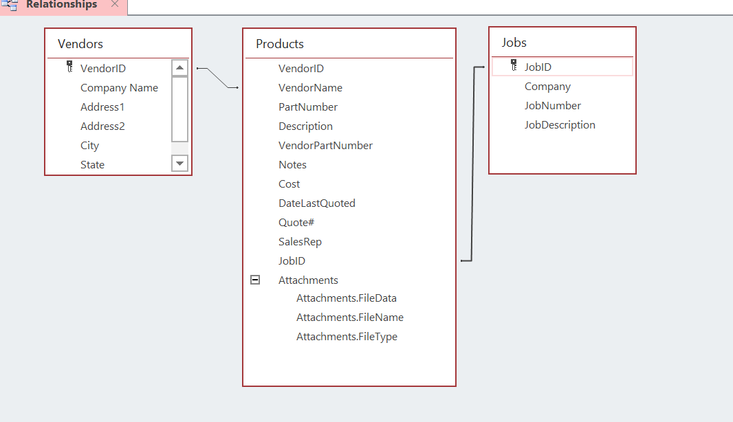 I've connected the Sales Rep in the Product Database to the SalesRepID in VendorRep. My only other connection is the VendorID to Company