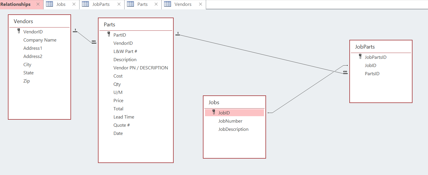 Hi. I would recommend against the "lookup field" idea. In your relationship, I suggest enforcing referential integrity for JobID between jobs and job parts tables. In your field names, I would avoid using spaces and special characters like &, /, and #.