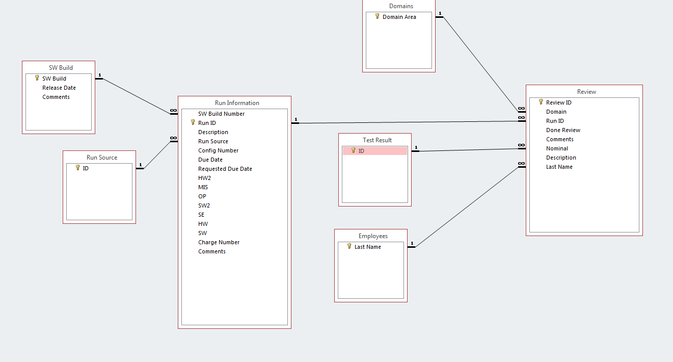 I originally was thinking about creating a query where I would be able to search by last name and show who had done what review based on whether or not they had checked the Done Review box. The problem with this was that unless a person created a review then a review wouldn’t exist at all so I wouldn’t be able to query whether or not they had completed it based on the check box. The other Idea that I had was to add a check box for each sub system in the run information table and then map the check box in the review form to that check box in the run information table based on the RUN ID and Domain info they entered into the review form. I haven’t been successful in that either as I haven’t found a way to dynamically update the control source of the check box in the form. Anybody have any ideas of how’d they’d implement this or something I’m missing? This is my first dealing with database development and I’m at a loss right now. Thanks.