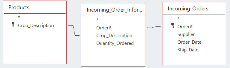 "Order#" (linked to "Order#" in "Incoming_Orders"), "Crop_Description" (Linked to "Crop_Description", the only field in the "Products" Table) and "Quantity_Ordered")