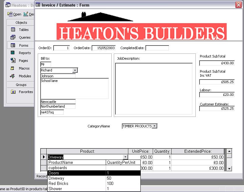 hi, i'm trying to select products from a subform but would like them to be displayed in their categories in comboboxes and if possible, sub-categories. I'm only a beginner and really dont know if i have set it up correctly!