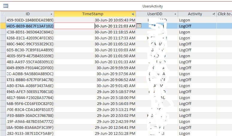 I have multiple user login based access database. There is table with name""UsersActivity". I created a form based on this table.