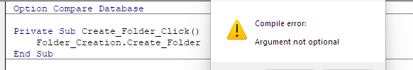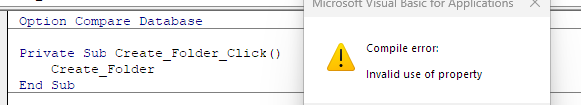 The other question is some minor technicalities. The code you showed first at least tests for possible conflicts, but there can be other issues than having that file already in existence. There is also the fact that you called Create_Folder a function but never return a value for it. Access might object because it wants to return a value for a function. FolderCheck is also a function that doesn't return anything. Both of these functions could be defined as SUB rather than FUNCTION and would execute perfectly well, but Access would not complain about not returning a value. Finally, the Create_Folder routine, if it exists in a general module, should be prefaced with PUBLIC so that code in other modules (like a form's class module) can see it and call it. NOTE: If not specified, a SUB in a general module is public anyway, but including the keyword PUBLIC makes it clear to any subsequent maintainer that the routine was intended for PUBLIC vs. PRIVATE access.