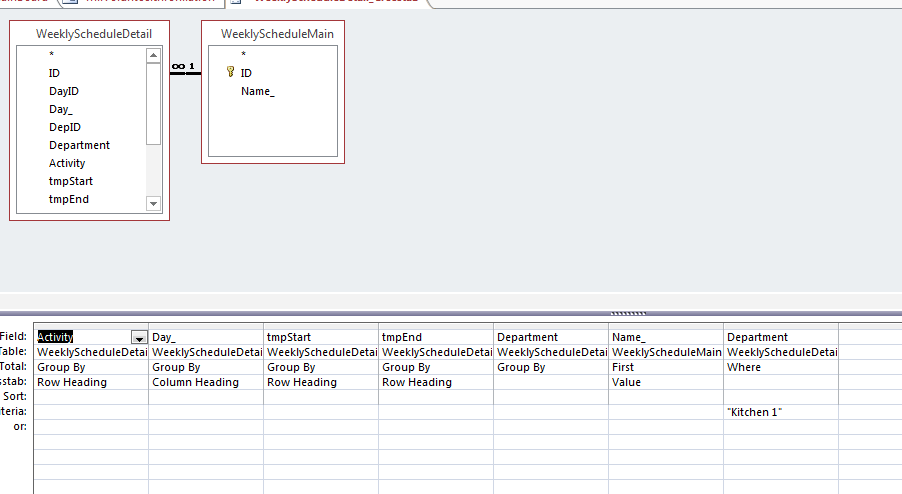 First. there is table CboTime. I would like to show the time slot in report from that table, Secondly, There is table called Weekly Schedule Detail so also wants activities from there based on the what department i chooses. All schedule information comes from WeeklyScheduleMain (only the name of person) and weeklyScheduleDetail(All detail from there).