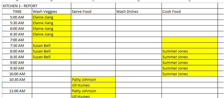 2. Which Volunteers have been assigned to those Activities so the user can see where there are gaps in the schedule (i.e. Activity times in which no Volunteer has been assigned) or overbooked (with more than one volunteer assigned to the same spot.