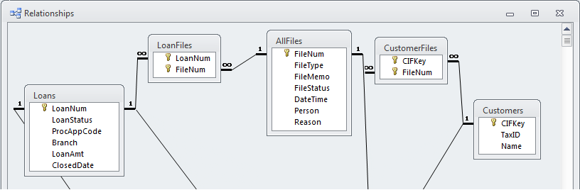 I have a table structure that I guess could be called a dual one-to-many-to-one, as can be seen in the attached Relationships screen print. Customer loan files are maintained in an AllFiles table, tied to the Customers and Loans tables through the CustomerFiles and LoanFiles tables. Users access the data from an unbound form called FileProcessing, where they can select a customer, and a loan for that customer. The files linked to that customer and loan then appear on a form called Files. However, I need the data on Files to be updateable, and I'm having a hard time coming up with a Files datasource that can be updated. The SQL that retrieves the needed data is: