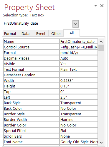 Here's a screenshot of how the dates look in the report. The ones before 2050 look right, but 2050 and later they default to the 4 digit year. And also of the report property sheet for the field in question, maturity date. It is the same in the form.