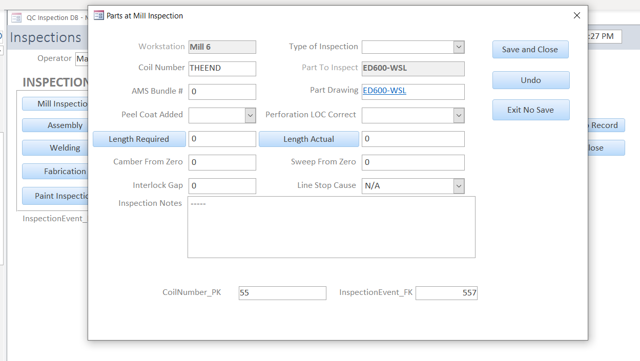 Then clicking the "Mill Inspections" opens form frmInspectMill which instantiates a new record in tblInspectMill. The click event of that button sets the value of a global value to the newly created InspectionEvent_PK - and passes it through to frmInspectMill and subsequently to tblInspectMill where it is recorded in field InspectionEvent_FK.