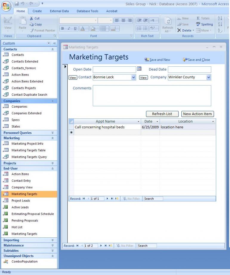 I have a form, Marketing Targets, which pulls records from a simple table that contains a field called Contact ID (key field). This form has a subform, Action Items subform, which also has the field Contact ID. The subform displays records that share the same Contact ID with the current record in the master form.