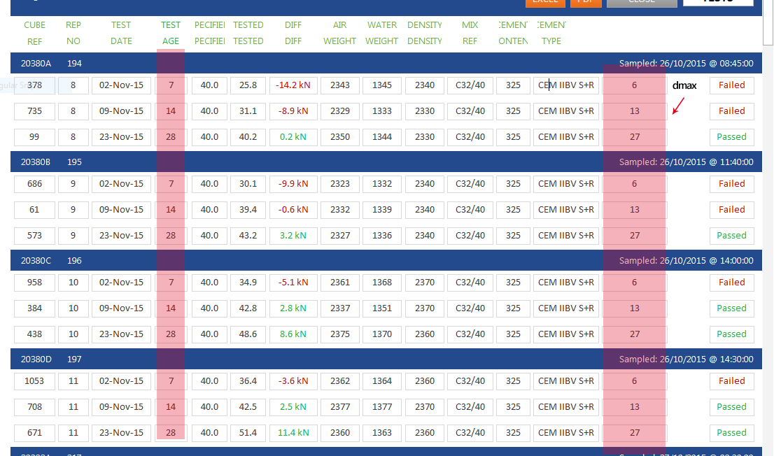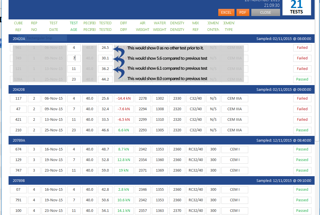 I would like to be able to tell the sample at 28 days to look at the sample from 14 days or whatever test age is next down and see the strength so I can do some math to work our growth since the last test. I can enter sample test dates from 1 to 100 so would always need it to look at the previous test and test age...?