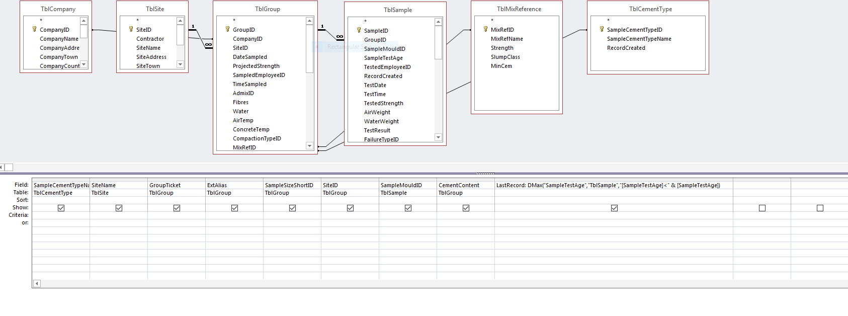 First, clear out all other tables except TblSample. Next, you need to use GroupID in your DMax criteria (you only want samples of the same group). Last, I'd rename it from LastRecord to LastAge. Because its not really the last record yet, its only returning the last age of the record.
