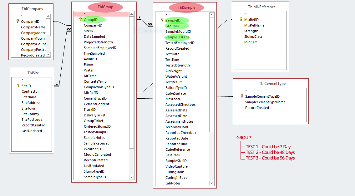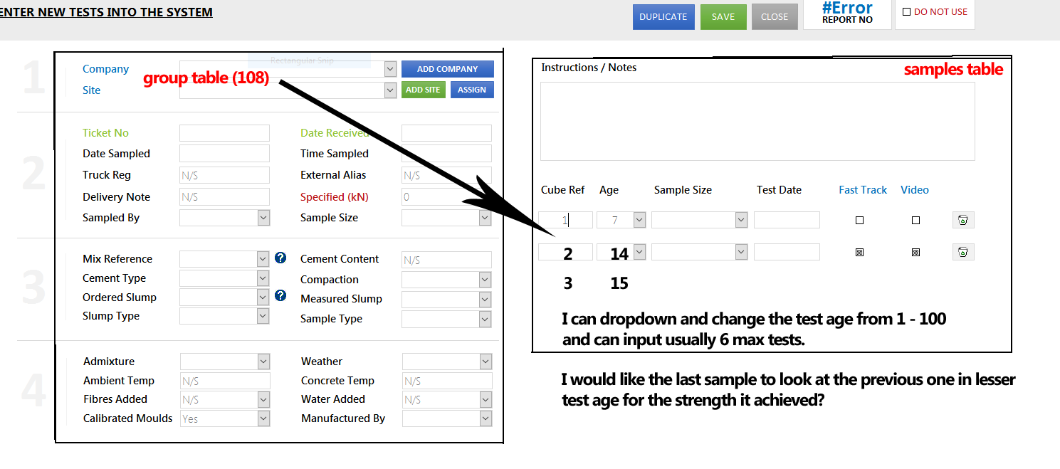 I enter the samples on my main test entry form. There is a sub form on the page which I enter the samples onto which usually contains between 1 and 6 samples. The main form is the group table and the sub form is the sample table so I have for example a group ID of 108 and say 3 samples within this group with their own sample ID's. Each sample has a test age assigned to it for example: