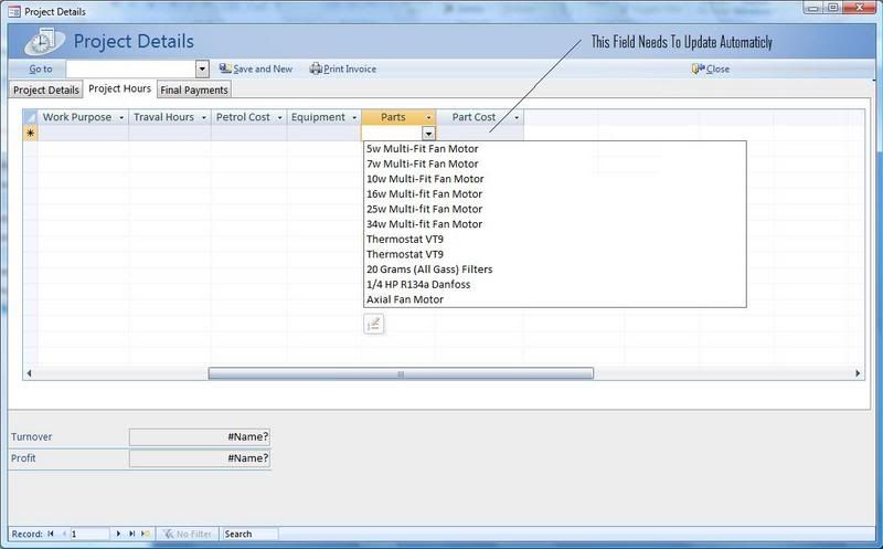 Its in a table format, what I need to do is when I select a part that I have used I want the price of that part to update automaticly in the next field. I have a seprate form that that has all the infomation of that part.