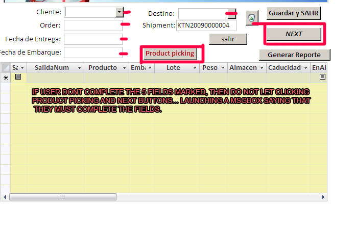 But I would like to make a VBA to check if one of those 5 fields, or the 5, or 4 fields are Null when user clicks on "button1" and then display a MSGBOX advicing to fill the fields.