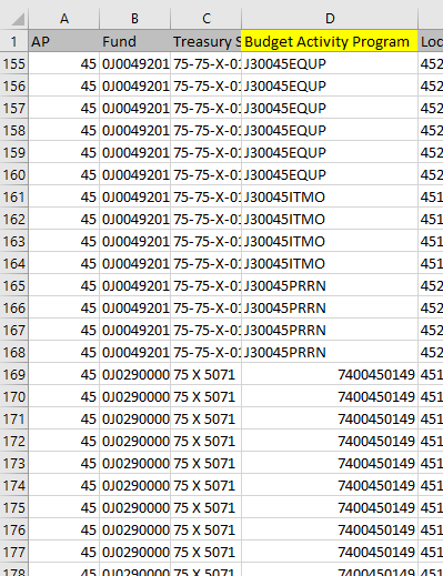 The problem is that one of the columns (Budget Activity Program) in the Excel file has data that is both numbers and text.