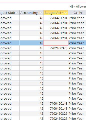 When Access imports the spreadsheet, it imports the Budge Activity Program column as a number format.