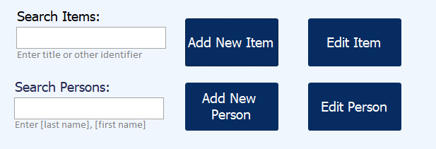 The Add New Item / Edit Item / Add New Person / Edit Person controls operate as intended. This is the code that operates them (using Add New Item button as example):