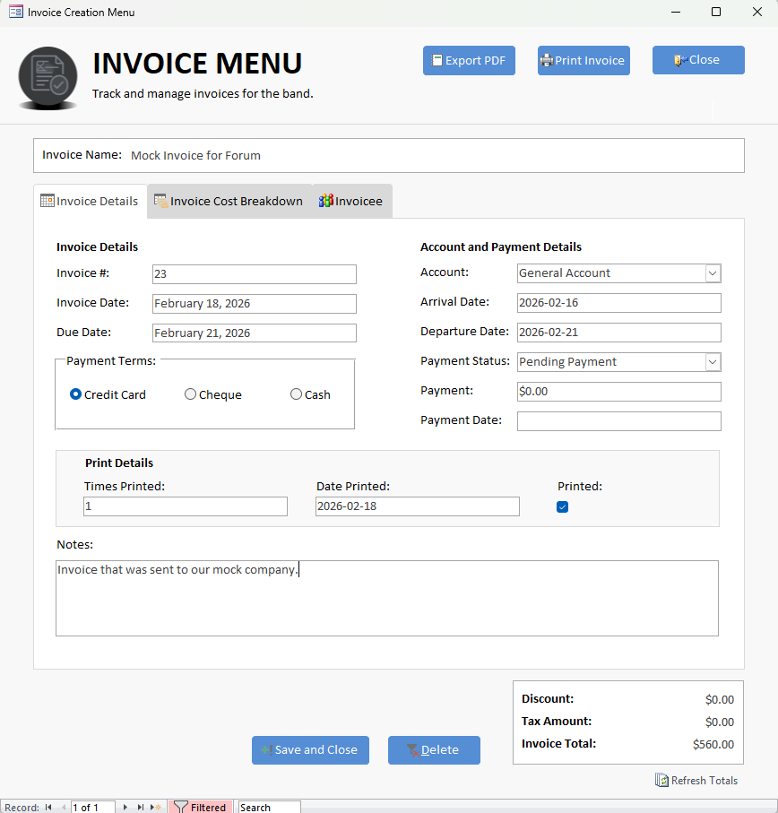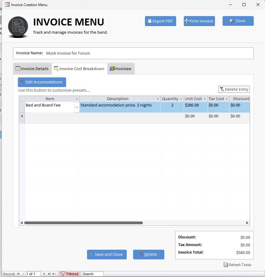 In my Invoice table, I have a field called fldInvoiceTotal (Currency). This total is calculated based on the records entered in a subform (shown in the picture “Invoice 2”). The user fills out the invoice details in the subform, and currently they need to press a “Refresh Total” button to update the value stored in fldInvoiceTotal. ("Invoice Total:" as shown in "Invoice 1")