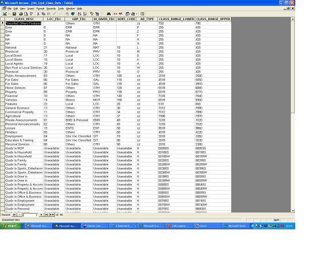 In the tbl_FDC there are a series of AD_TYPEs with the advert type zz. With a corresponding GRP_FDC, typically OTH, BMD, ETC. I have a problem in that the only fields that differentiates that values are fields named CLASS_UPPER and CLASS_LOWER which contain a range for the values? At present when I execute the query I am getting multiple invalid rows because the query cannot distinguish which CATEGORY it should allocate. Is there any way I can create a calculated column that is able to distinguish between the two? I have attached a screen dump of the tables.
