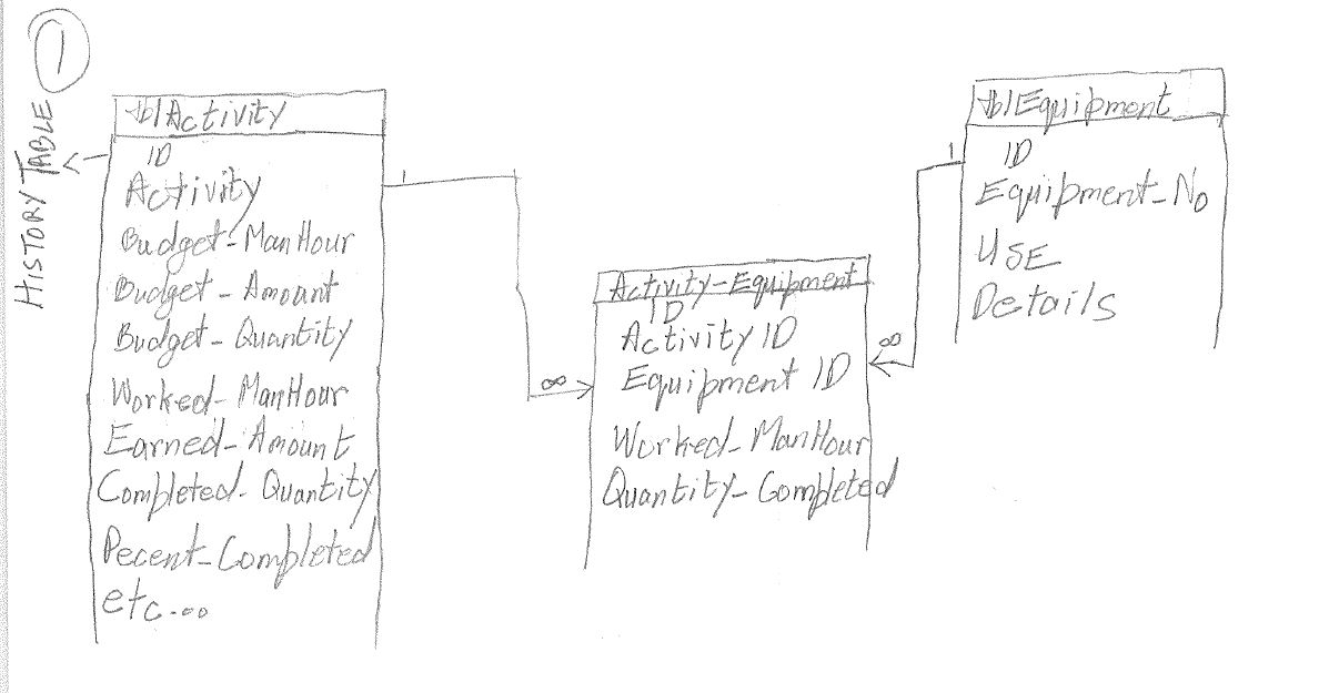 Each activity is later saved in History Table on daily basis to get the progress graph, as hinted in attachment 1. This will later be verified weekly from history table and any excess or missed quantity will be adjusted accordingly. I'm mentioning this because when it'll be verified, I'll then need to go back and make modifications in relevant tables via some automatic procedure according to adjusted amount. I'm mentioning this because maybe it'll have an impact in a way i am trying to design a database.