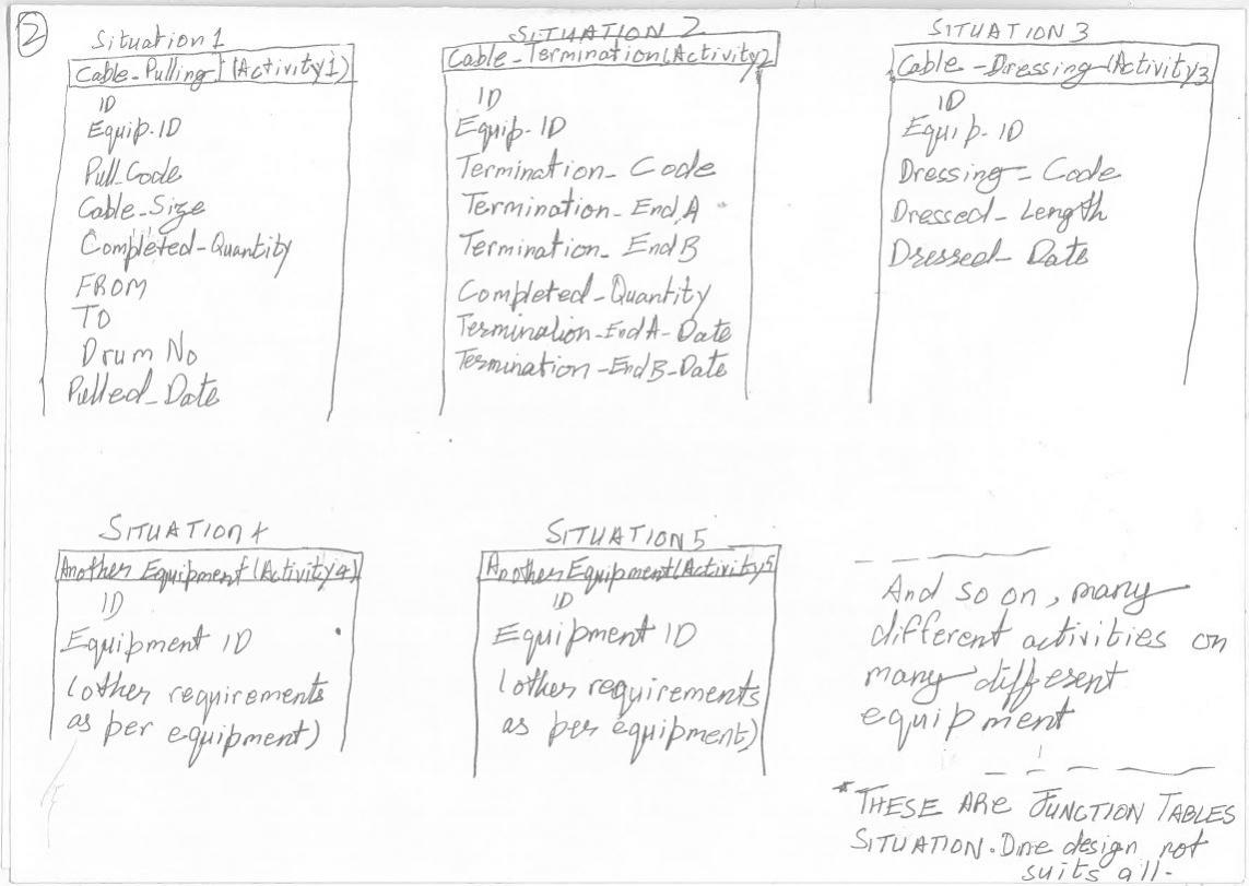 I've a design issue, yet again. I've two tables with many-to-many relationship, where number of activities could be done on an equipment, and similarly equipment might also be treated under certain activities. Junction table between those tables comes up with different set of requirements for each type of activity, on each equipment.