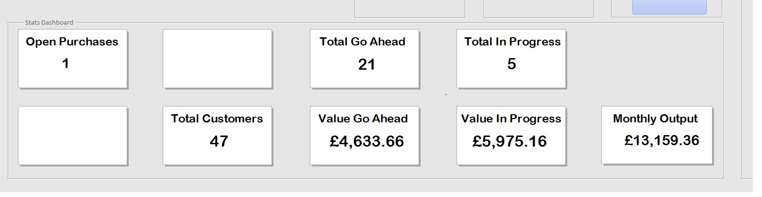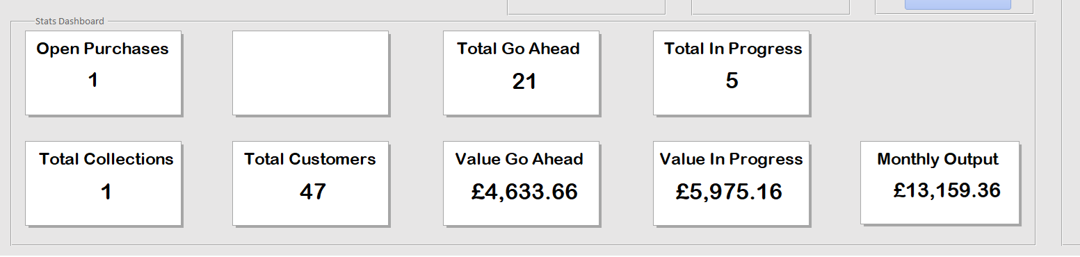 I have created a small dashboard showing certain statistics of my business. This is comprised of small subform squares on my main menu. These subforms are based off queries, and the forms control performs a count or totals this various data. Attached screenshot 1 showing a blank subform, 2 showing it displaying when there is returned results in the query.