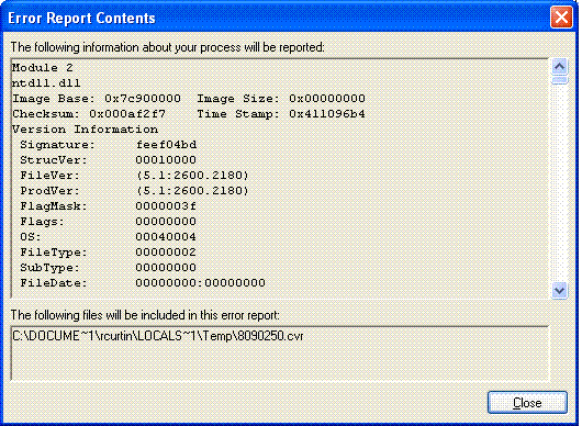 I've attached a screen shot of the contents of that error report.