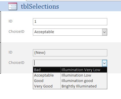I have a form that contains a drop-down text box with the values "Bad, Acceptable, Good, V Good" and I have another drop-down text box that contains "illumination is very low, illumination is low, illumination is acceptable" and so on.