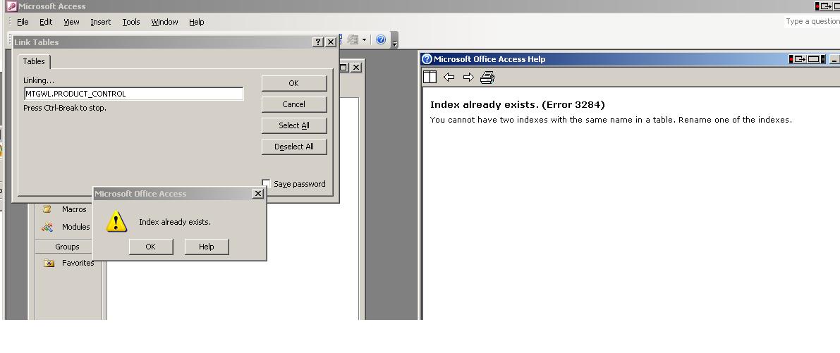 I am attempt to connect to a DB2 table via ODBC. However, each time I do, I get an error stating that the index already exists (two indexes with the same name). Our IT folks are telling me that this is not the case, and additionally, I am able to connect using ODBC in excel, and I am able to conncet to other tables in this DB. Does anybody know a method by which I could connect to this table? Thanks!