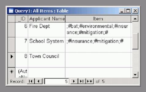 A less desirable choice is to use a multi-select control in Sharepoint. In this scenario, Access displays the multiple selections in a single field, as shown in the screen shot of the table created by the Access Link Tables wizard.