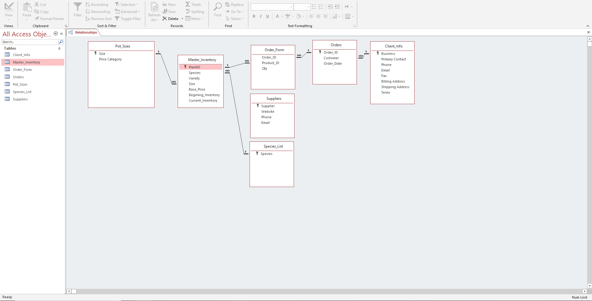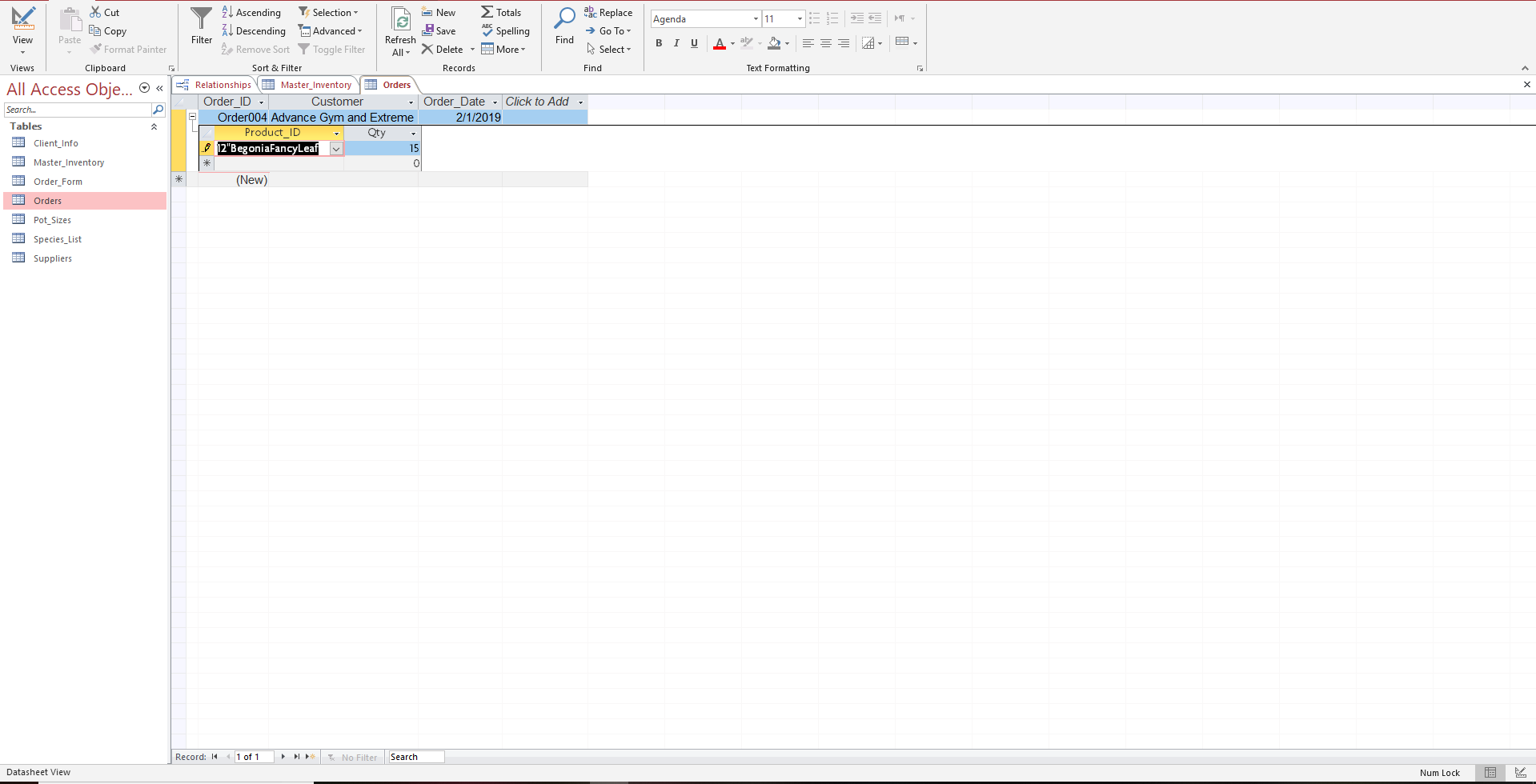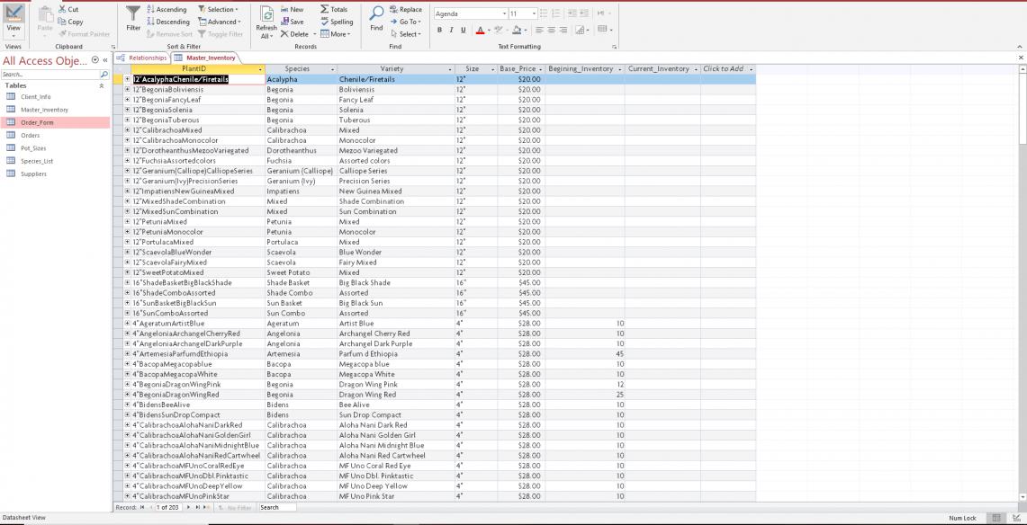 So in the Orders table, which is linked to the Order_Form Table I need the order of 15 12"BegoniaFancyLeaf to be removed from the "beginning_inventory" Field in the Master_Inventory table.