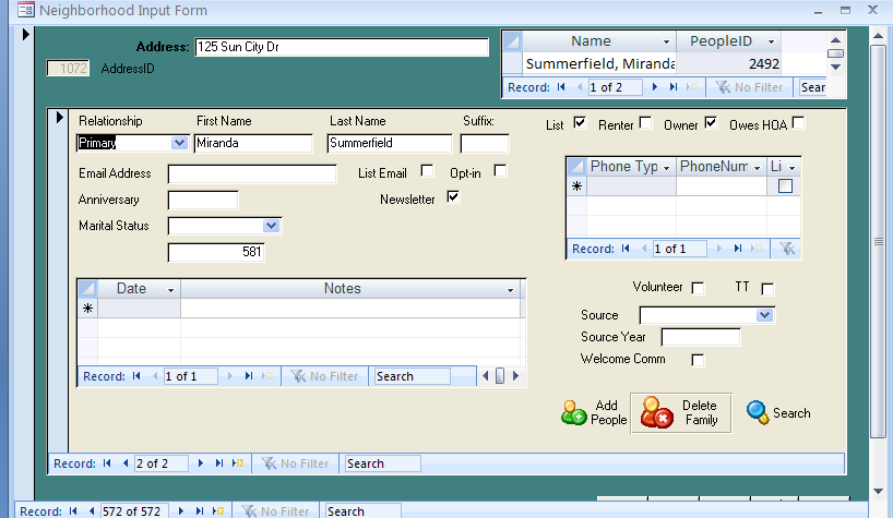 I've attached a screen shot of my forms. I currently have my family subform (upper right hand corner) linked to my main form on AddressID. To show all of the families associated with an address. There are two families.