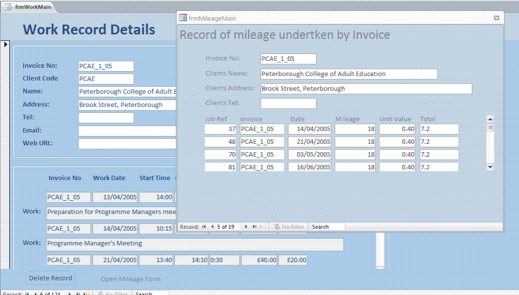 frmMileageMain has a subfrm that lists all the journeys taken for that invoice.