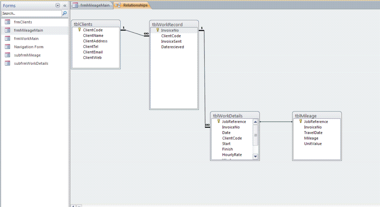 I have a main form called frmWorkMain that has a record source based on an SQL statement from three tables -("tblClients, tblWorkRecord and tblWorkDetails". There is a subfrm that shows (one-to-many) the details of work carried out for a specific job. So for example a Job record may have a number of works undertaken for the same job but on different days. The record source for the sub form is simply the work details table tblWorkDetails. the master/child links are based on the InvoiceNo field. Some jobs may require a visit to the site so I have a seconf form with sub form that allows records for mileage to be input. This form is accessed via a link on a label: the underlying code at present in the OnClick event is: