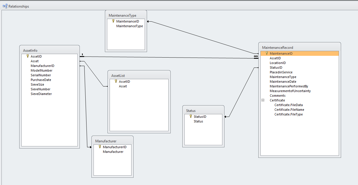 So, you did make that same mistake with MaintenanceType and MaintenanceRecord and you have 2 other tables that don't need to exist (Status and Manufacturer). You honestly just need 2 tables for this, AssetInfo and MaintennceRecord.