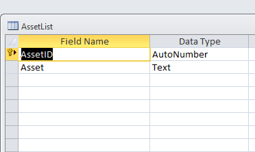 I have two tables AssetList and AssetInfo. Both tables have AssetID (field) as Primary Key. AssetList has all the names of Assets. AssetInfo has details for each asset (like serial number, model number and so on). AssetIDs are joined to form a relationship.