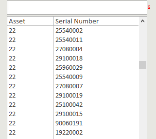 When I try to list both tables in my rowsource and select Asset and Serial Number, all is see is numbers for Asset. I see the serial numbers just fine though.