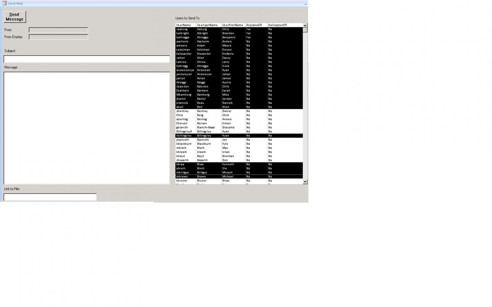 The appropriate # of entries in the tblMessage are being created based on my listbox selections so I'm on the right track I believe. Why is the recordset variable "rstMail(To)" not changing each cycle through the items selected? The code currently fills the To field in all records with the last selected item from the listbox. I've also attached a photo of the form used.