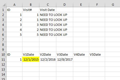 I have two spreadsheets, and I need to pull patients' visit dates from the second sheet based on the visit number in the first sheet. I've attached an example file and a screenshot below since it's hard to explain.