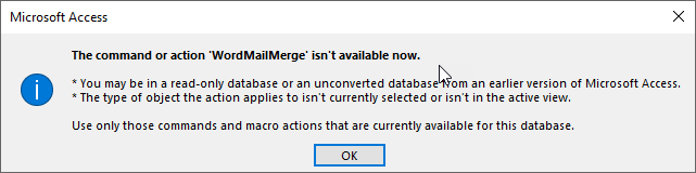 The error message may suggest you have an old MDB file an a newer version of Access. Is that the case? If so, try converting to ACCDB