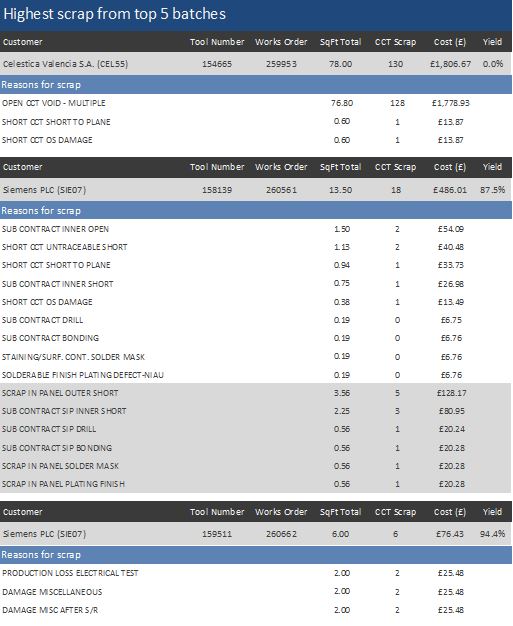 Ie. WO: 259953 | Scrap: Sub contract inner open; Untraceable short; short to plane etc etc.