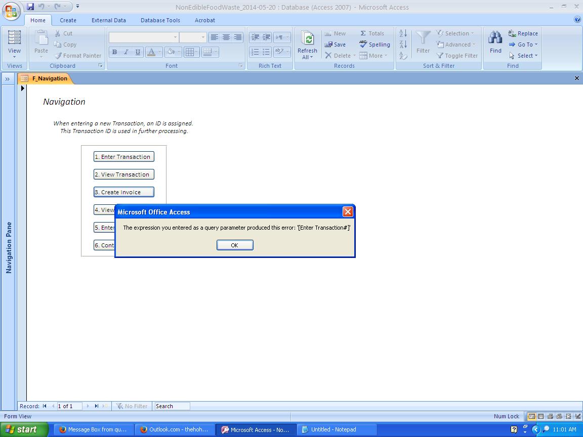 The code that Paul E provided worked after I edited the query (I got rid of the parameter of "Enter Transaction ID"). So now this code will pull up all the transactions that have not been invoiced. And if there are none the message box is displayed. So that works. However, the problem is that if there is more than one transaction to be invoiced you can go from record to record and back again. That enables the user to modify invoices. They should only be able to enter the data once, print the invoice, and then go on to the next one. Another issue that popped up is the print command. Using this code and pulling up all open invoices the print command button prints all invoices. (Where as before I was using the parameter in the query "Enter Transaction ID" to open only one transaction, then the print button printed just that one) . . .