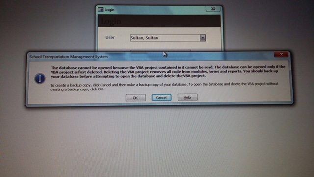 "The database cannot be opened because the VBA project contained in it cannot be read. The Database can be opened only if the VBA project is first deleted. Deleting the VBA project remove all the codes from the modules, forms and reports. You should back up your database before attempting to open the database and delete the VBA project"