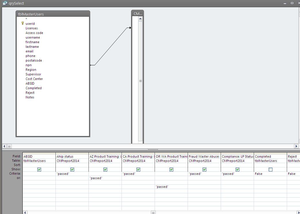 WHERE (((CMPreport2014.[Ahip status])="Passed") AND ((CMPreport2014.[LP Status3])="Passed") AND ((CMPreport2014.[LP Status4])="Passed") AND ((tblMasterUsers.Completed)=False) AND ((tblMasterUsers.Reject)=False)) OR (((CMPreport2014.[LP Status])="Passed")) OR (((CMPreport2014.[LP Status1])="Passed")) OR (((CMPreport2014.[LP Status2])="Passed"));