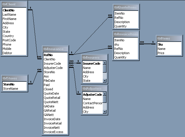 I would need a customer table an insurer table and an adjuster table. These tables would link to a Claim table. In the claim table I need to make it show the items that the person is going to get with there insurance money by getting details from a table with all of the information for the items.