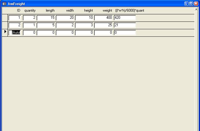 I have made a form that is used for taking bookings and on the form I have 10 lots of the above formula (it is conceivable that there could be 100 different dimensions but 10 is about the most I can get on my form) with a total box at the bottom. Its not pretty, its not functional and I know that I should not be storing this information. Therefore please let me know how I would start to do something like the following