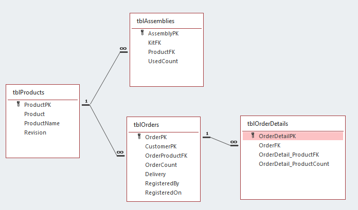 The blue rectangle is the assembly we have to produce. (It's shown here only with dLookup from tblOrders).