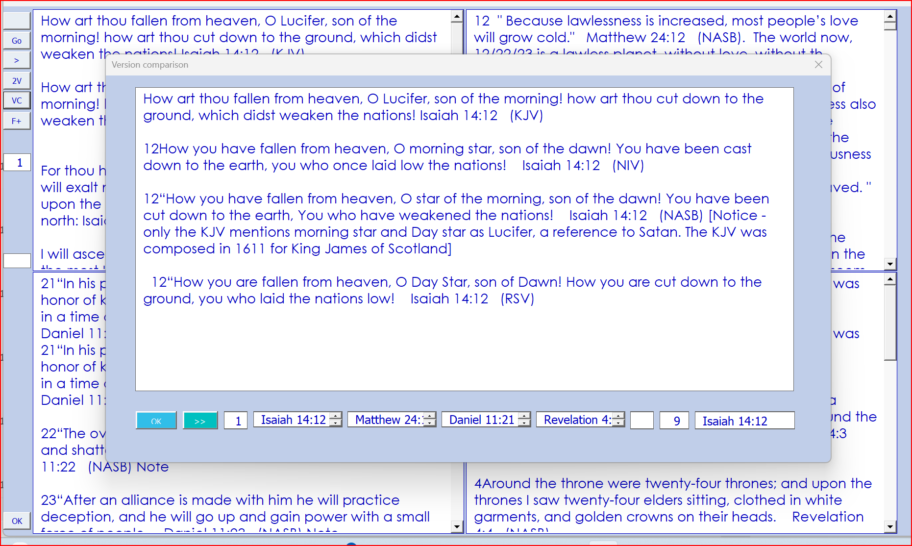 I continued working on this Excel version, of which I am much more experienced in Excel VBA, and until your kindness in continued help, I was about to give up on an Access version of this application because of my frustration with the difficulty in learning Access VBA very quickly. But now, I am reinterested in diving deep into the VBA Access and SQL code models. Even the most experienced had to learn from somewhere - either from analyzing form code solutions, or YT or some other online learning. That all said, here' why a translation verse comparison is important: image tells all: Only the KJV mentions Lucifer. the NIV, NASB and RSV - "star of the morning, son of the dawn, .."