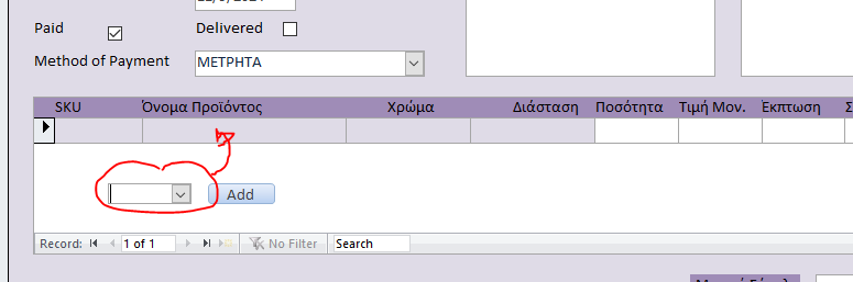 But then, even though it adds the proper product, it marks the Τιμή (Price) field which is a Dlookup to a query with an IF command. As you can see there is no |1 in the line in VBA so I'm stumped again