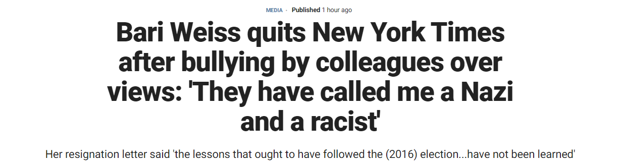 Yeah ... that's interesting. A good read as far as the quotes they took from her resignation letter, I'll have to read the whole thing tonight.I like the way they called her a Nazi even tho she is mostly likely Jewish. https://www.foxnews.com/media/bari-weiss-quits-new-york-times-bullying